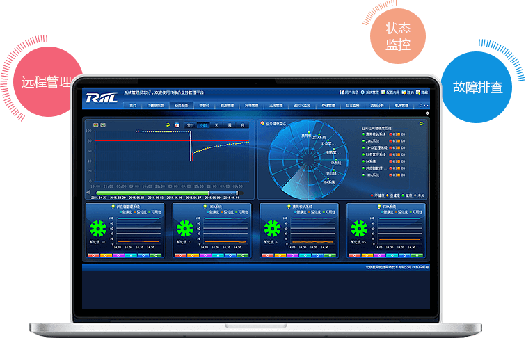 通过IT综合业务管理平台(RIIL)实现总部和省级单位的一体化管理,实现远程管理,状态监控、故障排查,设备工作状态一目了然。
