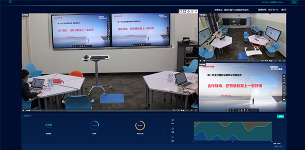 您可以看到实际部署的研讨型教室环境,沉浸式体验硬件大屏使用,优领课全阶段教学平台,督导老师巡课、统一运维等功能。