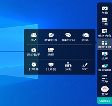 学生考勤签到、双屏教学、挑人、新建问答、新建讨论、抢答、同步教学、录课、分组、课堂互动投屏、多屏调度等。